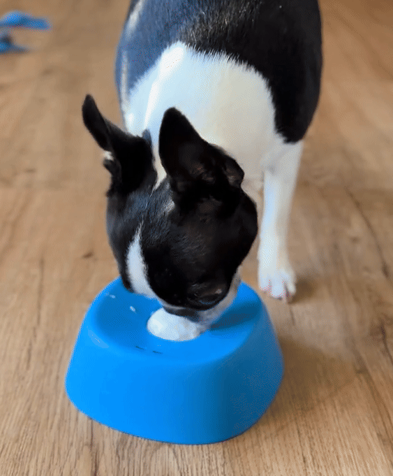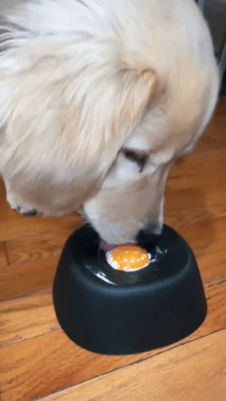 just add your dog’s favorite liquid or soft treats, place the bowl down, and let your pet enjoy licking and playing.